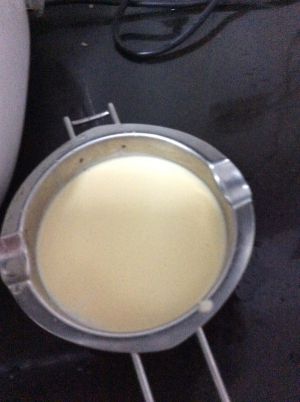 待稍凉后,加入蛋黄,筛入低筋面,混合均匀,一定不要有面疙瘩,若有,可用筛子过滤下混合好的蛋挞水。