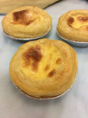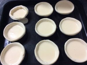 然后将准备好的蛋挞水倒入蛋挞皮,7分满即可,220度25分钟左右即大告成功