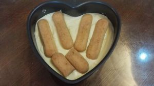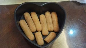 手指饼干,在咖啡蜜里面滚一下,注意不要太湿,也不要太干,鋪入容器底层,倒入混合好的4,至容器大约一半的位置,再铺上一层沾了咖啡蜜的手指饼干。(入没有咖啡蜜,可以用咖啡粉和朗姆酒调配,根据个人口味调配比例)