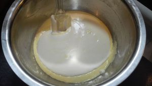 糖浆缓慢冲入蛋黄液,电动打蛋器开至高速,边倒边搅拌