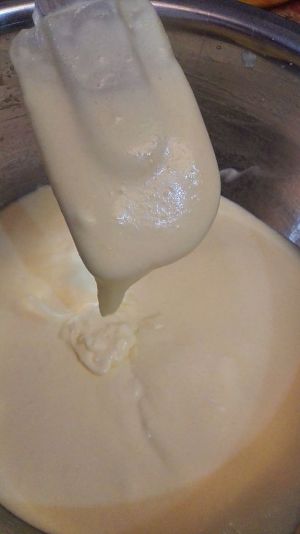 和手温差不多时倒入蛋黄糊,边倒边搅拌,有颗粒的话,可以再隔热水搅拌至顺滑