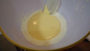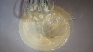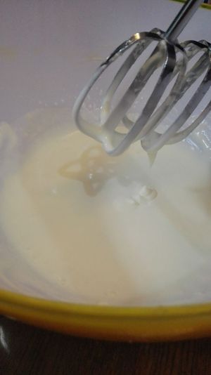 奶油倒入不锈钢盆,搅拌成2分熟。(5分钟左右)