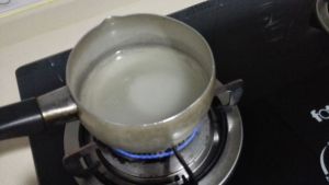 水、细砂糖一起倒入锅里加热煮成糖水,直到沸腾。
