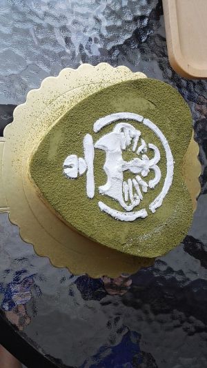 我另外用了一个糖粉筛片,筛了一个可爱的多啦啊梦的图案,可惜掌握得还不够娴熟,有的地方糖粉筛后了,影响图案的美观。
