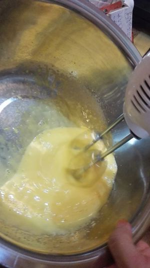糖水沸腾以后关火,一边用打蛋器搅打,一边缓缓倒入第3步打发好的蛋黄。蛋黄倒入完毕以后,继续用打蛋器搅打,打5-10分钟左右,此时蛋黄糊的温度应该已经降下来了,和手心温度接近。