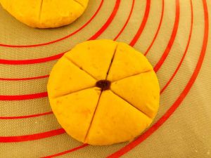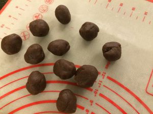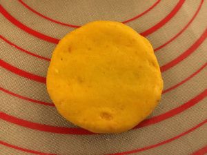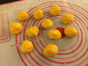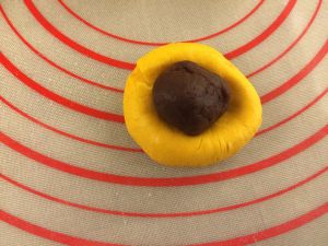 取一小块南瓜团子搓圆,取两片饼干夹在中间,轻轻捏一下夹紧。