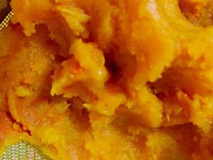 趁热把南瓜加入白糖和糯米粉和在一起揉,粉要多放一点,不能加水。揉硬一点。