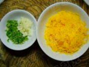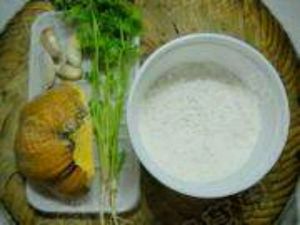 南瓜去皮、洗净、擦成丝;蒜、香菜切细粒备用。