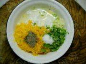 南瓜、香菜、蒜倒入面粉中,加入胡椒粉、盐,加入适量冷水。