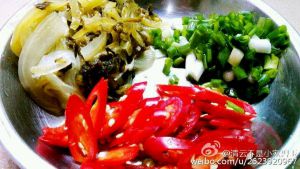 酸菜在水里泡一会,切丝备用,辣椒和葱切好。