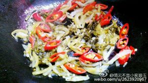 锅里加入油翻炒酸菜放入辣椒酱
