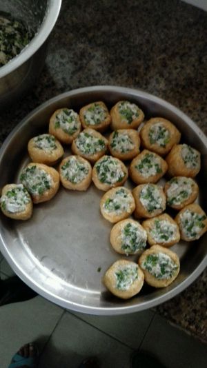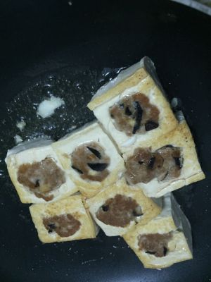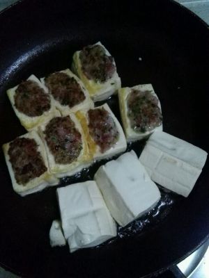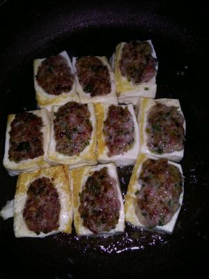 如上图酿满肉,锅放好油,烧开油,酿肉的那边向下,大火煎黄在翻另面煎