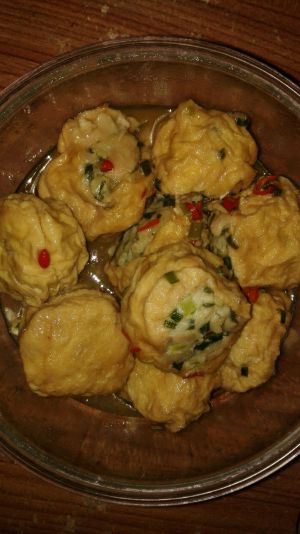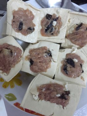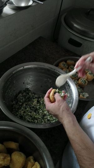 中间我省略了拌肉和挖豆腐洞。肉里我拌了酱油,盐,鸡精,油,生粉,木耳,香菇。失策就在于,原来豆腐挖出来后,也可以跟肉拌一起再酿豆腐。所以导致我剩下一堆碎豆腐和肉泥。
