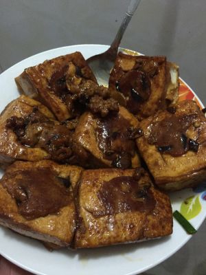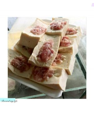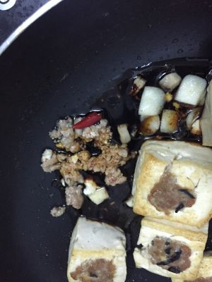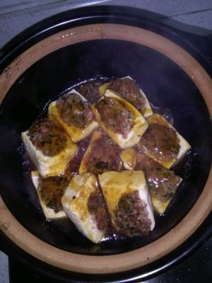 制作步骤 1.把肉剁成馅料,加入适量的盐、酱油、胡椒粉,葱花,调和。 2.把豆腐对半切开。 3.用筷子直接在将肉掐进豆腐里。 4.把馅料塞入豆腐中。这个地方更容易把豆腐搞烂,抓豆腐的手势要注意,很难言传。 5.豆腐一一酿在碟中好后,准备煎豆腐。油锅要热、油要多,直接把整碟豆腐顺着倒入锅中。撒入适量的盐,用微火煎。 6.豆腐小火煎至一面金黄,把豆腐铲入砂锅中,加入高汤、适量胡椒粉,如果有红曲也可以加入少量,微火炖。 7.心急吃不了热豆腐,稍长时间微火炖,尝尝豆腐里面热了,即可加入香菜即可起锅食用。 注: 1.如果没有砂锅,可以直接用煎豆腐的锅炖,但是加入汤后必须把豆腐都铲松动,否则容易焦。