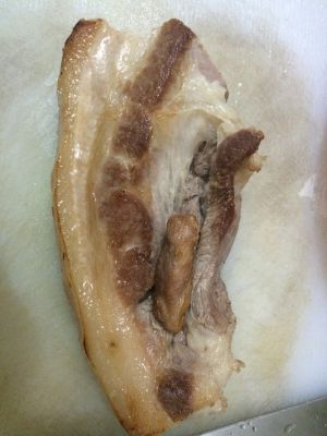 五花肉,加入姜、八角、香叶,在清水里煮7-8成熟。捞出沥干水趁热抹上老抽上色。腌制半小时左 右