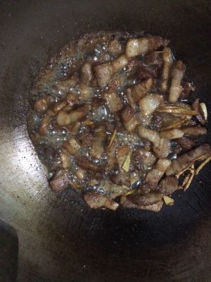 锅里加油,烧至三成热,下肉使其上色,(炸肉时会蹦油)