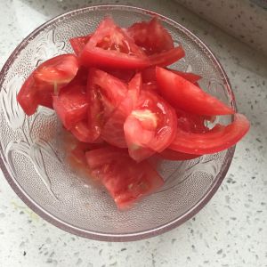 准备好西红柿和鸡蛋。西红柿切成块。鸡蛋打碎。
