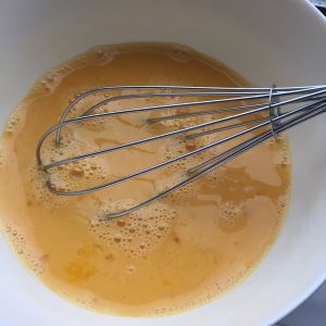 将15克食用油倒入小美主锅,3分钟,120度,小勺速度。然后将蛋液从主锅口上方非常缓慢地倒入主锅内。3分钟,120度,小勺速度。然后盛出。