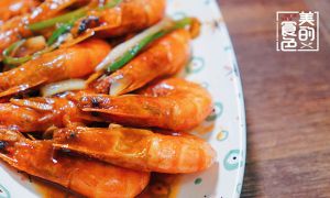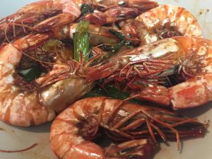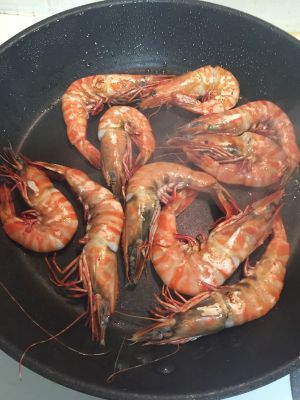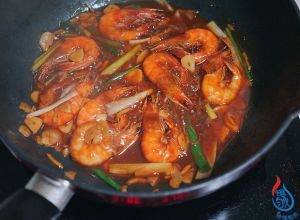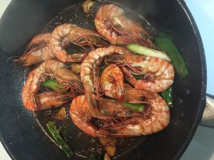 再次倒入少许橄榄油,放入姜片,葱段,(大葱切段)炒香放入虾继续翻炒两分钟,倒入兑好的汁,翻炒收汁,起锅
