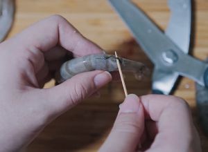 鲜活大虾,开背去虾线,放入料酒,鸡精,腌制20分钟。