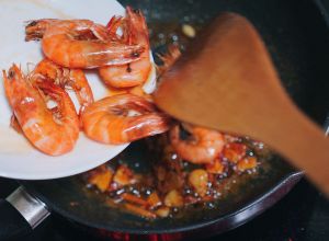 倒入煎炸好的虾,再次翻炒,炒的时候可以轻压虾头挤出虾膏,然后加入半碗清水