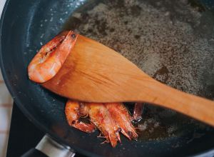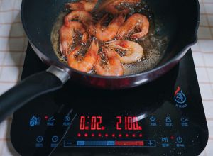 倒入少许橄榄油,油微热,入虾翻炒至红色盛出