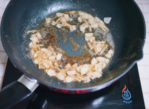 锅内只留少部分油,再次打开美的电磁炉选择炒菜模式,放入蒜片、姜丝翻炒