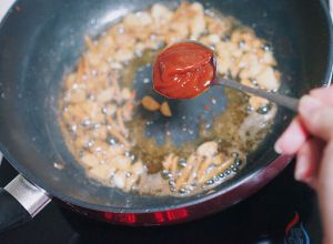 另起锅油热后倒入两勺番茄酱!烧热后把炸好的虾倒入锅内翻炒均匀!