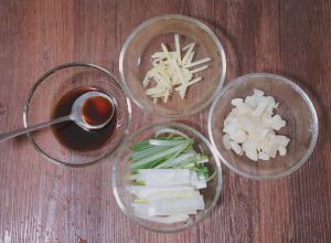 葱、姜切丝、蒜切片,将生抽、料酒白糖调和成汁