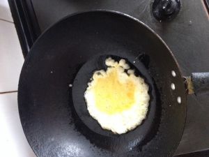 接着把大块的鸡蛋炒散,这一步只要10秒,马上关火。避免焦糊。