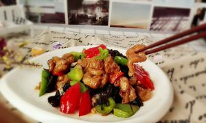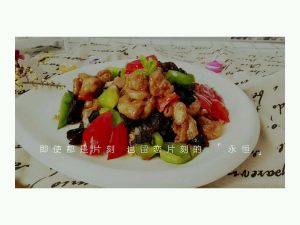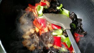 放入肥肠,青红椒,木耳。翻炒几下即可。