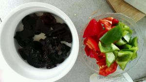 将青红椒改刀,大蒜切末儿,黑木耳泡发(黑木耳需要提前泡发,如果你着急,你可以把木耳放微波炉饭盒里,加适量温水使劲摇晃五分钟即可)