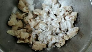 将买好的肥肠改刀成滚刀块,并加入盐,白胡椒,一勺料酒,少许蒜蓉进行调味,加入玉米干淀粉抓匀,对肥肠进行上浆。