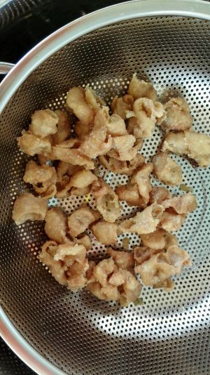 油温达到五到六成热时,肥肠下锅,小火慢炸至金黄。我建议肥肠也一个一个的炸,这样不会粘在一起。耐心点,亲爱的们。