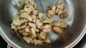 肥肠切滚刀块,加入少许淀粉.蛋清拌匀,炒锅中多放一些食用油,油热后将肥肠入锅中划开炸制微黄捞出控油。