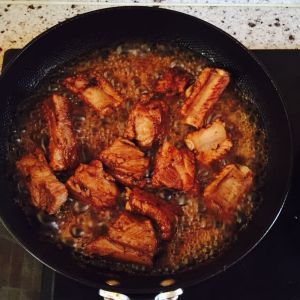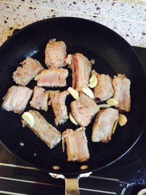 1.排骨切成段平底不粘锅倒油把排骨煎黄,捞出待用。,加料酒和15克生抽拌匀,腌半小时,