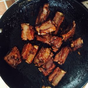 将煮好的排骨沥干水分,放入热油锅里煎至焦黄即可。因为排骨之前已经煮过,肉已经熟了,所以不用煎很久。