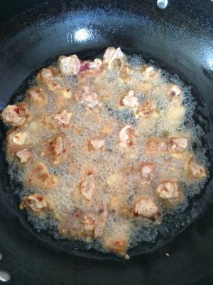 将腌好的排骨入油锅开始大火定型,捞出中火炸熟。