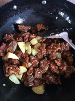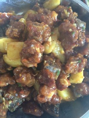 油倒出剩锅底一点,放蒜蓉䓤姜煸炒放入炸好的排骨土豆炒一下放入生抽糖醋鸡精翻炒加半碗化开的地瓜粉水倒入锅中翻炒一下