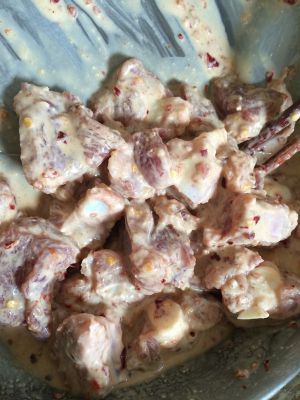 把排骨洗干净放盐黄洒生抽鸡精地瓜粉辣椒粉用3勺水拌开淹一下