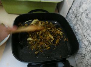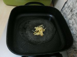 锅里放油烧热,放入葱姜丝煸出香味,然后放入酸菜翻炒大概四分钟。