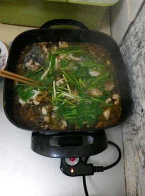 将酸菜盛入碗中待用,留下锅内的酸菜汤,这样防止锅内菜太多,鱼片不容易熟, 将腌好的鱼片逐片放入汤中,用筷子拨散,等鱼片煮变色,用盐、糖、鸡精、胡椒粉调味,用深盘盛出,烧少许花椒油浇在鱼片上即可。