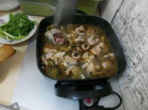 加入适量开水(或骨头汤),放入调味料,水开后放入鱼骨,煮上五分钟,然后放入鱼片煮熟(鱼片颜色变白即可,时间别太长,容易老了)。