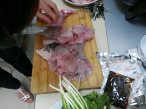 将洗净的鱼先片出鱼肉,将鱼骨剁成段,鱼肉片成鱼片。如果片不好的话就直接连着鱼骨剁成鱼块好了(我也片不太好,片出来的鱼片有些厚,连骨头剁成块的话也不错,就是吃的时候麻烦些,不过笨人么?没办法)。
