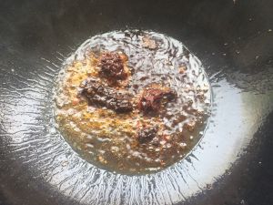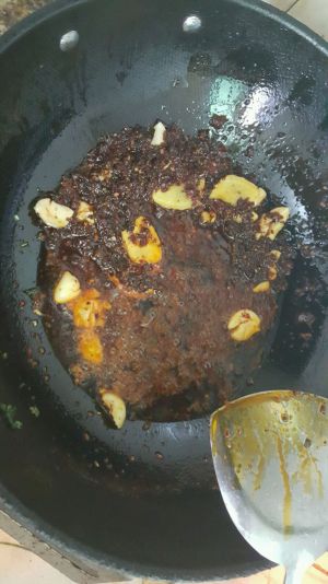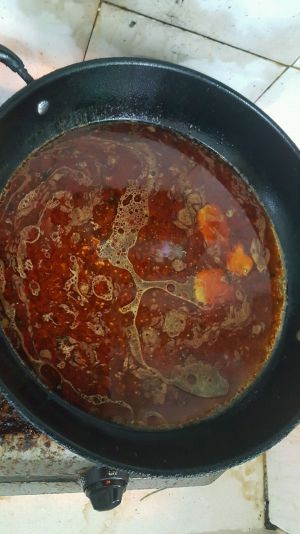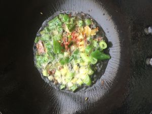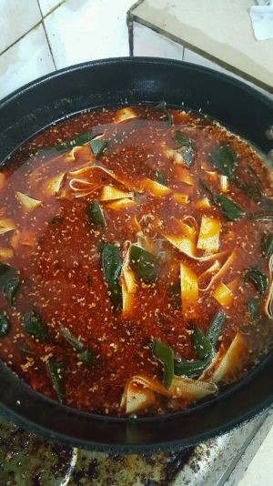加辣椒,俾县豆瓣酱,炒熟,加水。
