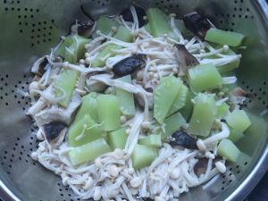 莴笋金针菇香菇,水煮七成熟不要太烂哦。捞出备用。
