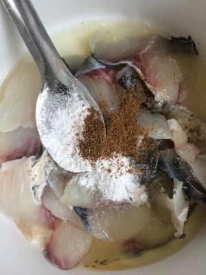 鱼片用鸡粉,花生油,香油,盐,鸡蛋,粉包(鱼料包水)和生抽醃两分钟;