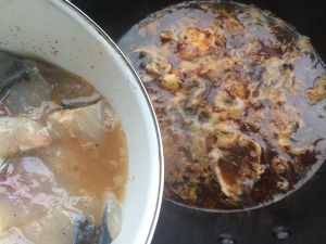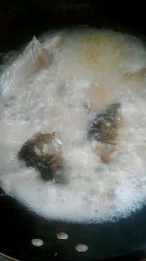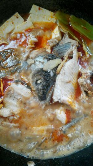 热油,放姜片,豆瓣,炒香倒入鱼汤。(自家吃把鱼头也煮进去了)想要的锅底煮好