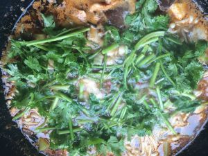 水烧开后将鱼片倒入摊开,洒上葱和香菜,再煮一分钟即可。