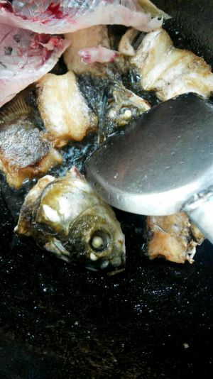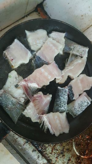 将鱼骨用盐醃5分钟,上锅煎至两面金黄;